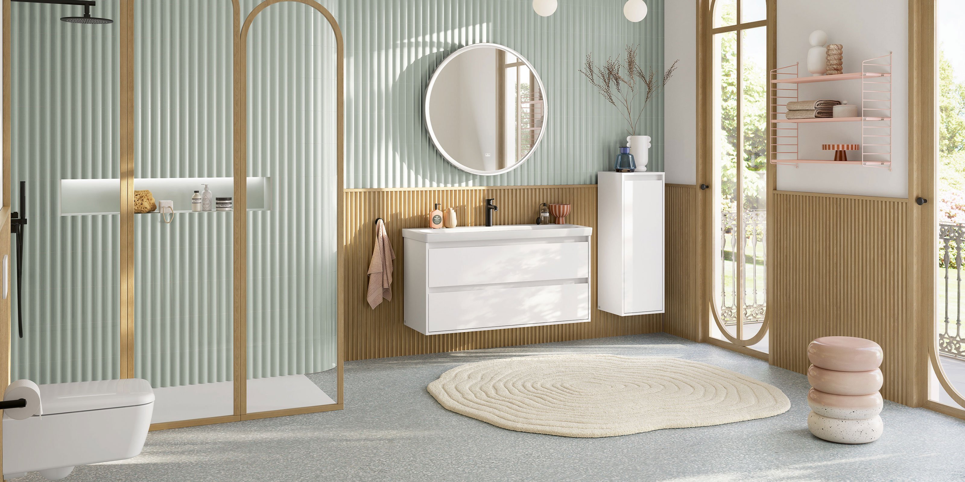 Ein Badezimmer in Salbeigrün wirkt ruhig, natürlich und modern. Erfahre, wie du Sage Green mit Holz, warmen Neutraltönen und passender Beleuchtung kombinierst.