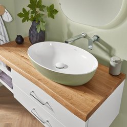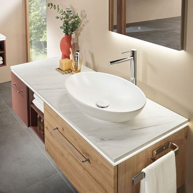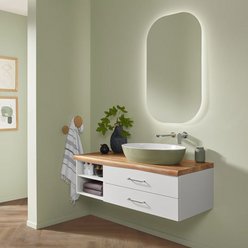 Extra-Slim, Slim-Light, Slim, Massivholz, Classic und Light in unterschiedlicher Optik – modellabhängig mit oder ohne LED, zusätzlich in Bi-Color. Flexible Gestaltung mit breiter oder schmaler vertikaler Platte. Fronten wahlweise mit Griff, mit Griffleiste oder grifflos mit integrierter Technik Push to open. Clevere Details wie ein Wäschebehälter im Schrank, eine Sitztruhe für mehr Komfort und vieles mehr. Maßflexible, offene Regale in nahezu allen Breiten ermöglichen auch in schwierigen Raumsituationen die passgenaue Planung. Verschiedene Keramik-Becken oder edle Glas-Waschbecken wählbar. Imposante Auswahl an Größen, Formen, Materialien und Farben für jeden Einrichtungsstil