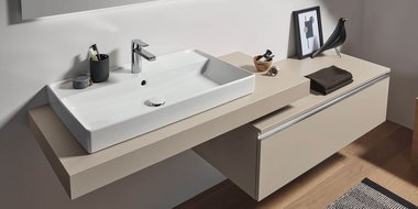 Das geräumige Solitärmöbel in Sandgrau-Matt und die gleichfarbige 2morrow Platte Classic ergänzen sich optimal. Die schwebende, asymmetrische Anordnung sorgt für Stauraum mit großzügigen Ablageflächen und erzeugt dabei eine Leichtigkeit, die durch den Reflection Lichtspiegel LUCA noch unterstützt wird. Zusammen mit platzsparenden Cubes in Kontrastfarbe entsteht eine moderne Badlösung.